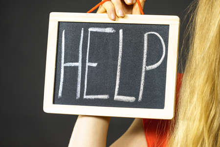 female hand with red chalk writes help on a black chalk board, close up