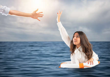 Businesswoman in the ocean with lifebelt receives help