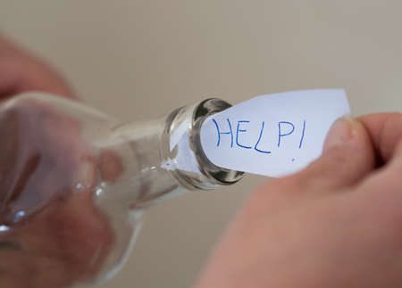 a woman's hands put-take a help message in a bottle