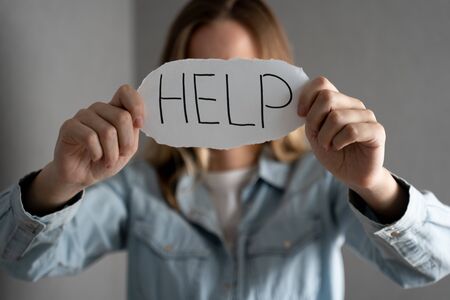 Call for help. Woman unrecognizable holding piece of paper with inscription, panorama, copy space, studio shot