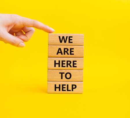 We are here to help symbol. Concept words we are here to help on wooden blocks. Beautiful yellow background. Business and we are here to help concept. Copy space.