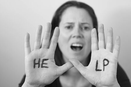 Girl asking for help. Girl stretches out her hands with the word help in the palms
