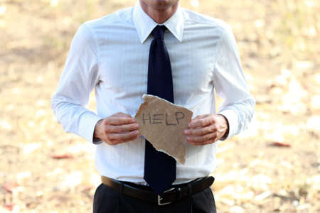 Help. The word is written in uneven letters. A man's hand holds a white paper rectangle with text against a gray background.