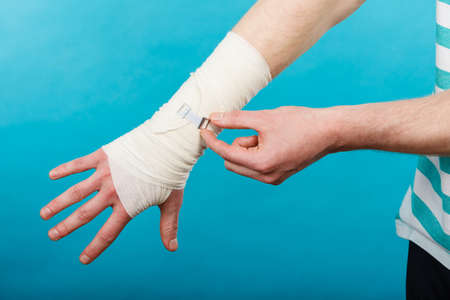 Fractures and dislocations concept. Male hand in white bandage. Helpful medication for painful palm arm of young man.