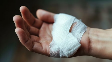 A person with a bandaged hand is holding their hand up in a fist. Concept of pain and discomfort, as the person's hand is wrapped in bandages