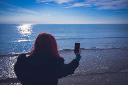 close-up on the phone while taking a picture at the Baltic Sea on winter day