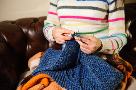close up the womans hands knitting a blue woolen sweater