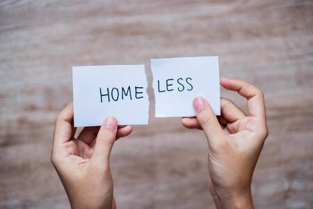 man hand holding white paper with the text Homeless change word to Home. positive attitude, crisis, jobless and economic recession concept