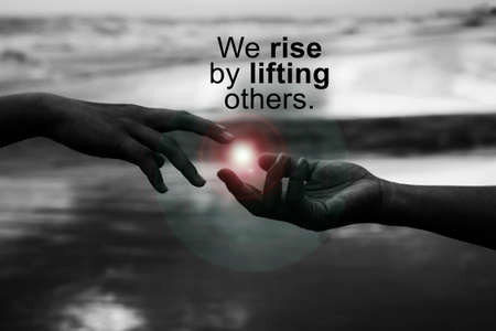Inspirational quote - We rise by lifting others. With helping hands touch the light, reaching out each other. Strength kindness and humanity support concept in black white abstract art background