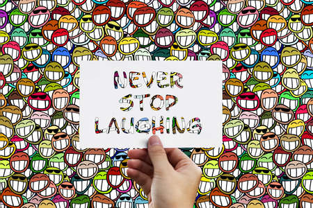 A closeup shot of a male holding a sign never stop laughing with smiley faces on the background
