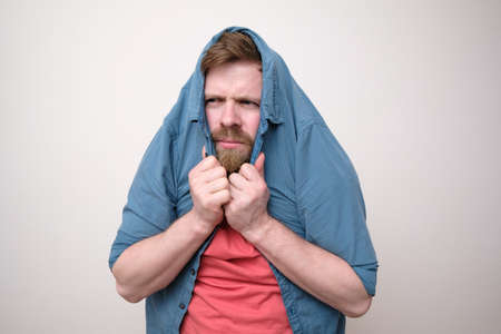 close up of a frozen young bearded man in winter coat looking at camera isolated on grey wall background, studio portrait. portrait of mature male who feels very cold intside