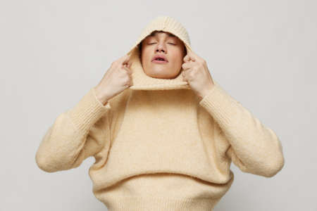 Horizontal studio shot. A handsome young man with dark short hair combed back in a beige sweater with a high neck stands on a gray background and pulls it over his head
