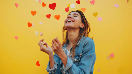 Young woman standing in front of a wall with hearts, capturing social likes in a creative concept of social networks.