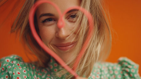 A woman smiles while holding a pink heart shape made of string in front of her face. The background is orange with light fabric.