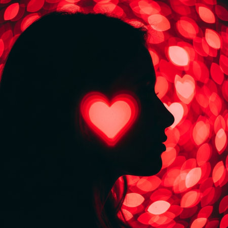 Abstract, luminous red and pink bokeh lights, subtly shifting into indistinct heart formations, view