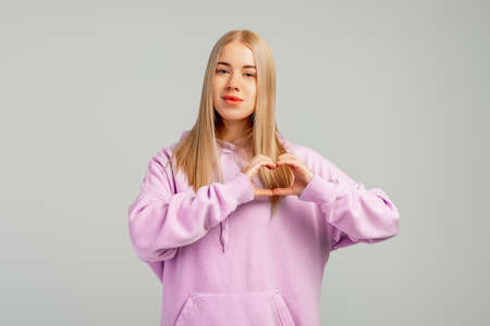 Portrait of attractive cheerful girl showing heart shape sign amour, standing in trendy hoody over gray background. Sign of love, harmony, gratitude, charity. Feelings and emotions concept