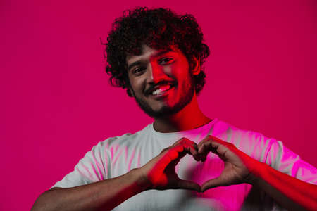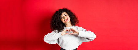 Beautiful young woman with curly hair showing heart gesture, say I love you and smile romantic at camera, standing on red background
