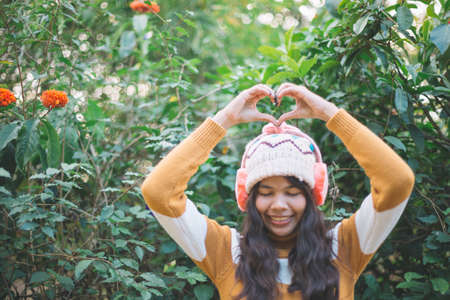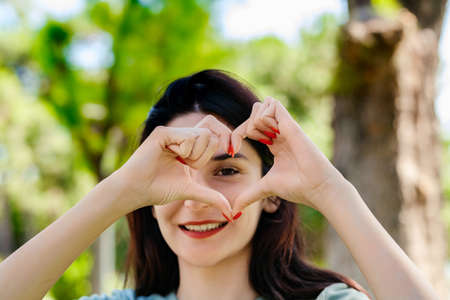 In love with world. Closeup portrait of modern smiling Chinese Asian girl showing heart shaped hands to camera, while standing outside in the summer green trees city park background.