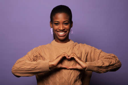 I love you. Portrait of a thankful young african woman holding fingers joined in like sign. Headshot of loving black female looking at camera show heart symbol over violet background.