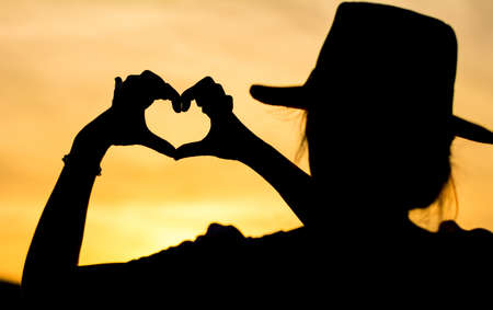Attractive caucasian long hair female posing in front of the camera in silhouette showing love or heart gesture outdoor at sunset with sky view. Romantic or love concept. High quality image