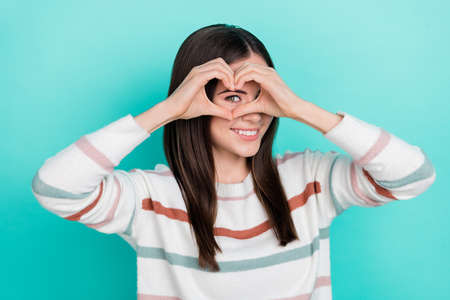 Photo of dreamy funny woman wear striped sweater showing arms heart cover eye isolated turquoise color background