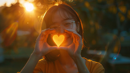 Generative AI : young woman making heart with her hands round the sun in sunset