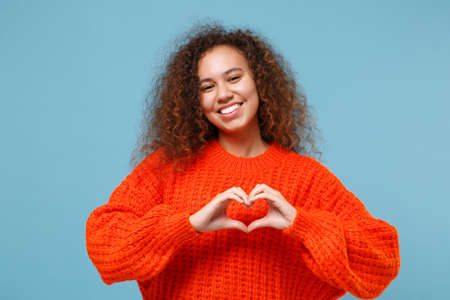 Smiling young african american girl in casual orange knitted clothes isolated on pastel blue background. People lifestyle concept. Mock up copy space. Showing shape heart with hands, heart-shape sign.
