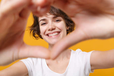 Smiling young brunette woman girl in white t-shirt posing isolated on yellow orange background in studio. People lifestyle concept. Mock up copy space. Showing shape heart with hands heart-shape sign.