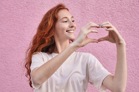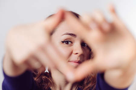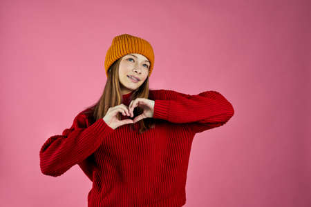 Caucasian girl with hands makes a heart-shaped gesture as a symbol of love