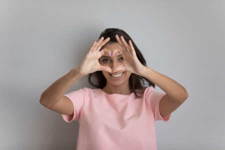 Positive smiling middle eastern woman looking at camera through heart shape of joined fingers. Portrait of young attractive arabic lady posing in studio isolated on grey express love romance gratitude