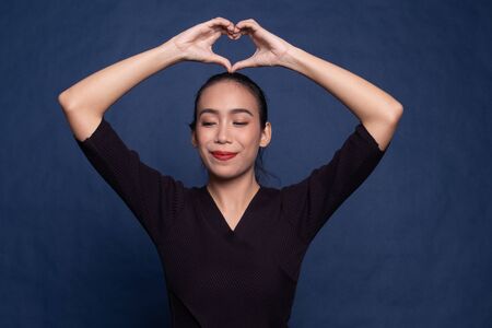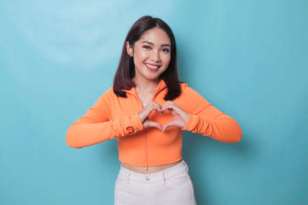 Attractive young Asian woman feels happy and romantic shapes heart gesture expresses tender feelings wears casual orange top against blue background. People affection and care concept