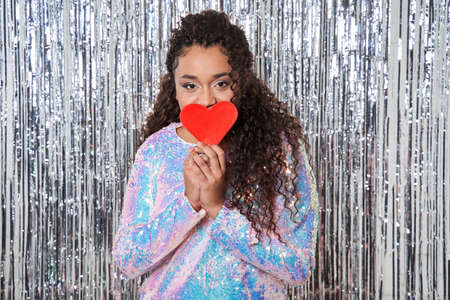 Cheerful woman with curly haircut wearing sparkling dress hiding her face behind the paper heart