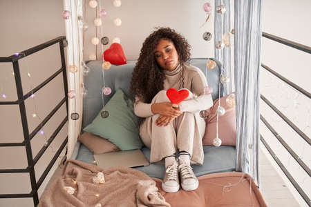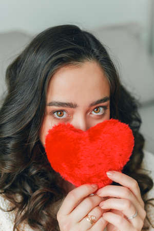 Emotional portrait of 30 year old woman in knitted stylish cardigan. Young beautiful dark haired curly woman holding red plush card heart on valentine's day in her hands. Cozy home.