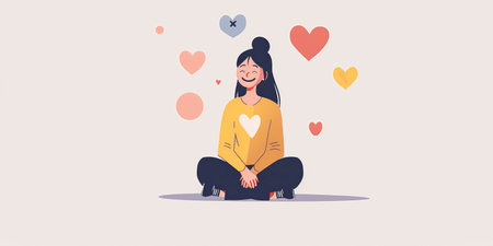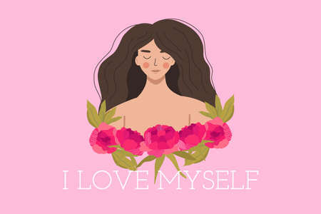 mental health concept. A young woman smiles and hugs a bouquet of peony flowers, symbolizing mental health care. I love myself. flat vector illustration