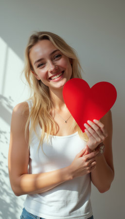 A cheerful young woman with long blonde hair beams as she holds a vibrant red heart cutout against a softly lit background. Her joyful expression radiates warmth and love, making this image perfect for conveying affection and positivity.