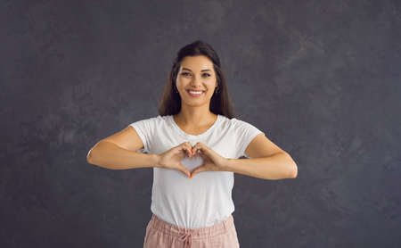 Portrait of a young smiling woman showing a gesture of love standing on a gray background. Friendly Caucasian woman showing heart to camera. Concept of romance, body language and love.