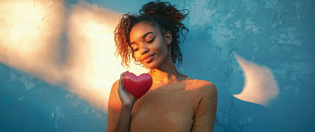 Young woman holding a red heart against a textured blue wall with soft lighting, expressing love and affection, creating a warm and romantic atmosphere