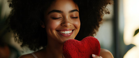Woman smiling and holding a red heart, expressing love and affection for valentine's day or a romantic occasion, a tender and sweet moment of joy and happiness