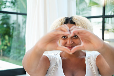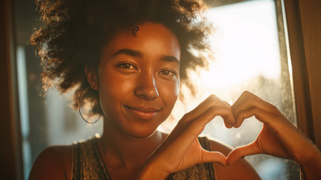 African American woman in a sleeveless top forms a heart with her hands, smiling softly. She is backlit by the warm glow of a sunset through a window, creating a cinematic effect.