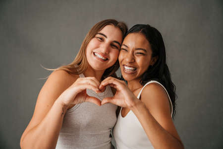 Lesbian lifestyle girlfriends doing heart shape symbol with hands