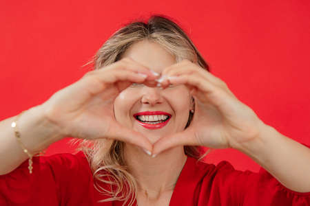 Portrait closeup of happy woman with white snow smile in red outfit with perfect bright makeup isolated on red background. Love expression, making heart shape by hands at face level. Healthy teeth