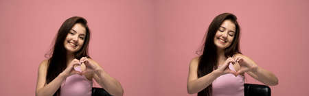 Set of two portraits of a smiling young brunette woman showing heart gesture with two hands and looking at camera isolated over pink background.