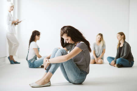 Lonely depressed girl sitting alone on a group psychotherapy