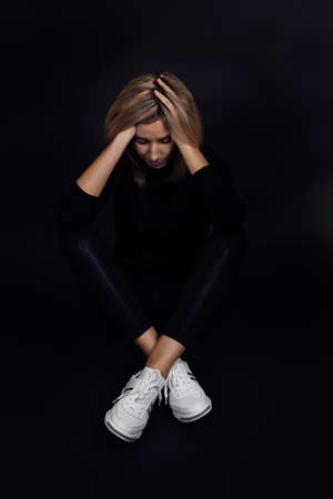 Tired blonde woman with head down and eyes closed, hands touching hair sitting on floor on black background. Physical and mental abuse. Relative aggression