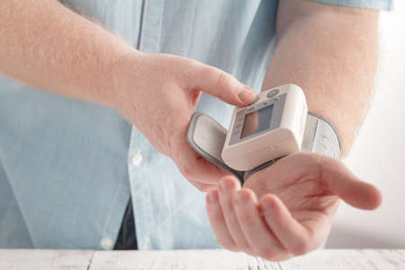 stressed man measured his blood pressure with a handheld device and found the pressure was higher than normal