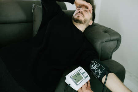 Man measuring blood pressure with tonometer himself at home sitting in armchair
