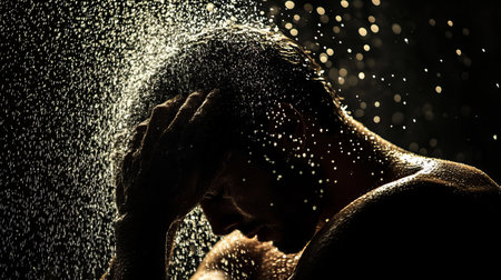 A person enjoys a refreshing shower in the morning, surrounded by glowing water droplets that evoke a sense of calm and rejuvenation.