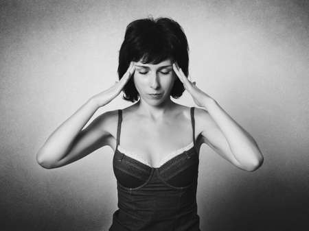 A young woman has a headache with her eyes closed and her hands hold her temples.