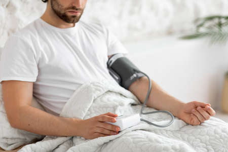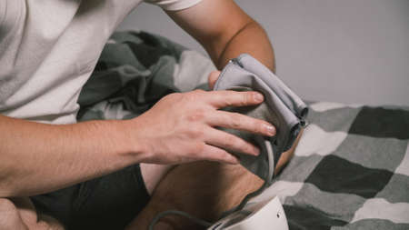 Young caucasian man measures blood pressure at home in bedroom sitting on bed at home clothes. Male uses medical instrument tonometer to check his own blood pressure. Hypertension at young age.