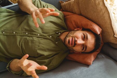 Top view of a gesticulating young man lying on the sofa in his psychotherapists office